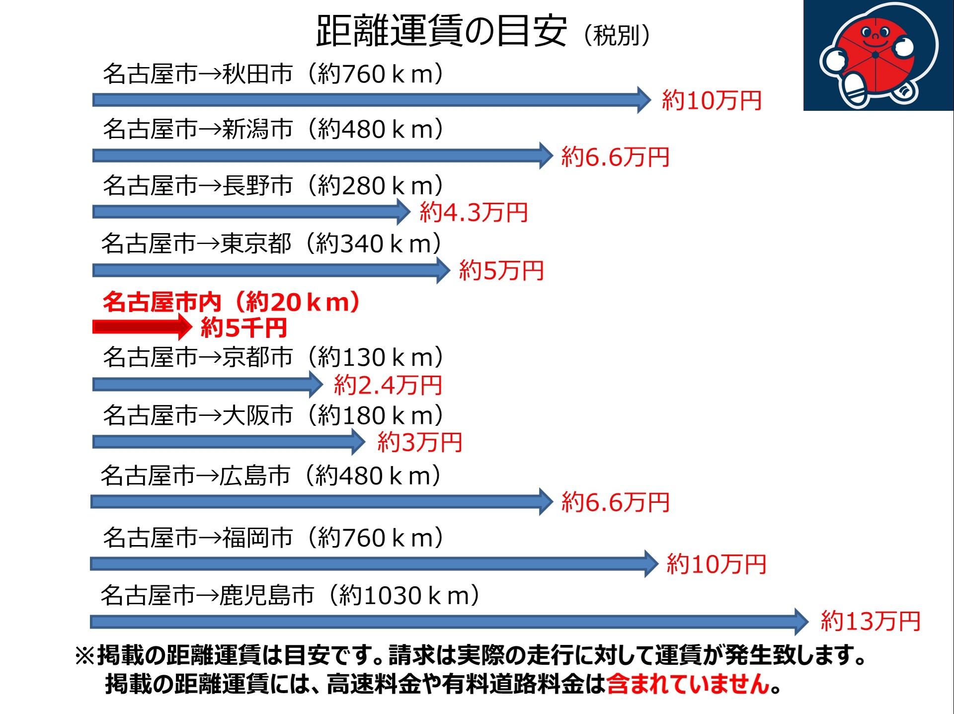 5,000(20kmと作業料30分)+4,400(オーバー距離20km)=9,400円(消費税別)